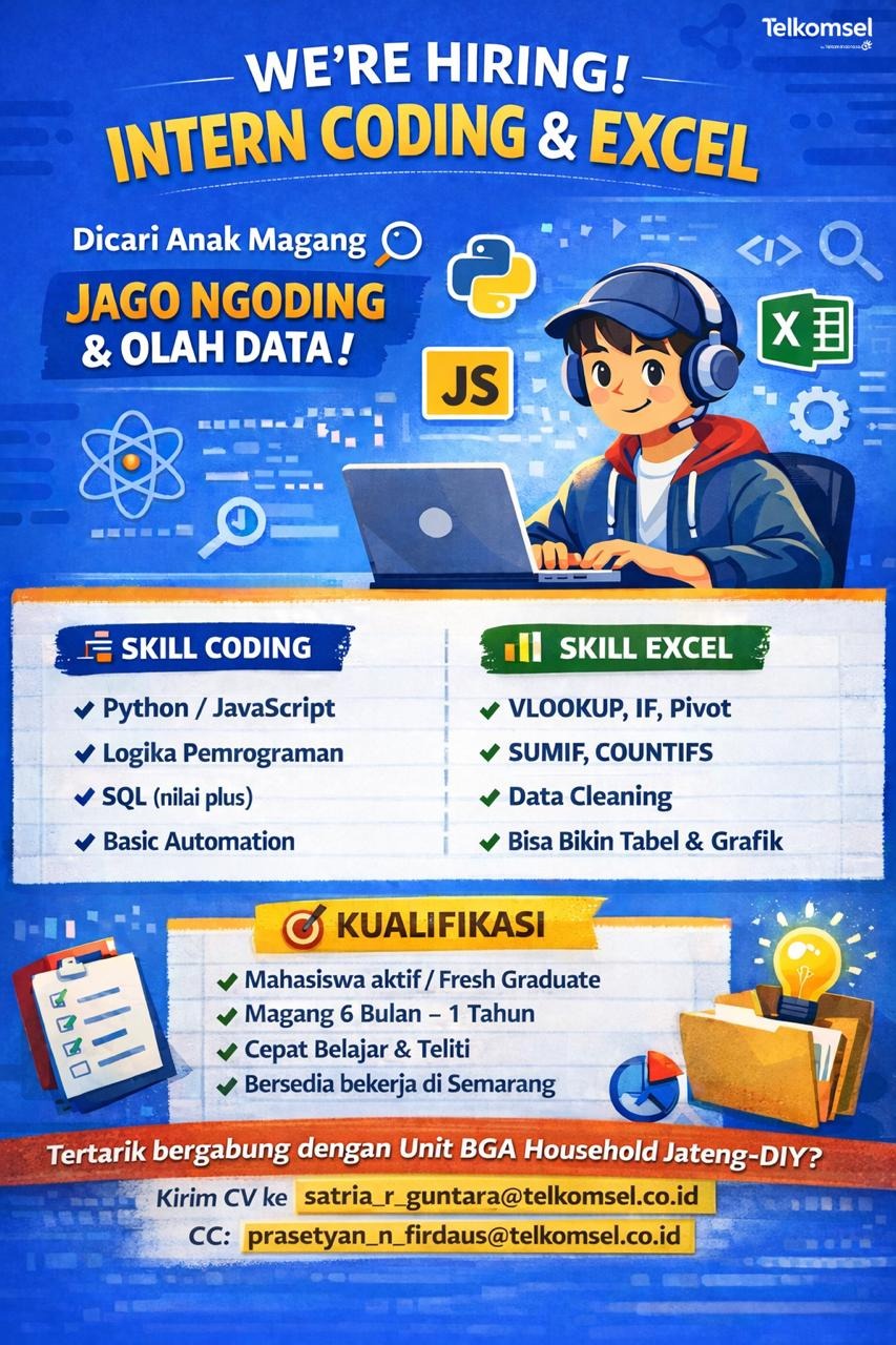 Punya skill ngoding dan jago olah data? Ini kesempatanmu buat magang di Unit BGA Household JatengβDIY (Telkomsel).